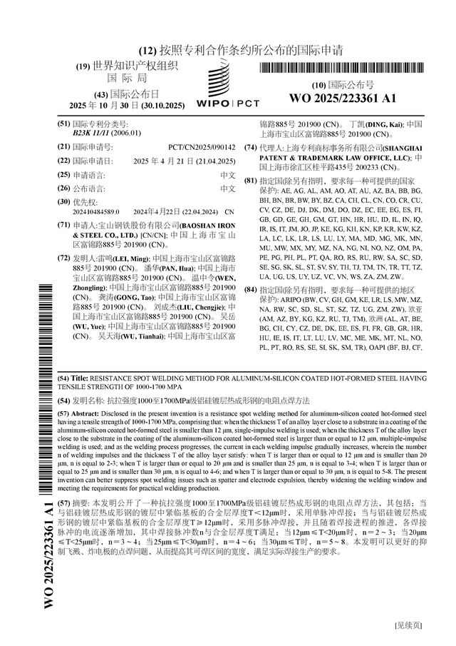 证券之星消息,根据企查查数据显示宝钢股份(600019)公布了一项国际专利申请,专利名为“抗拉强度1000至1700MPa级铝硅镀层热成形钢的电阻点焊方法”,专利申请号为PCT/CN2025/090142,国际公布日为2025年10月30日。