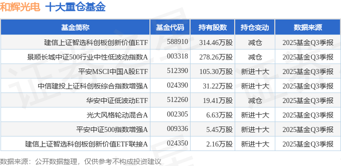 持有和辉光电最多的基金为建信上证智选科创板创新价值ETF,目前规模为2.62亿元,最新净值1.3183(10月31日),较上一交易日下跌1.02%。该基金现任基金经理为张溢麟。