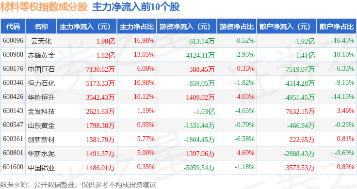 资金流向方面,材料等权(000071)指数成份股当日主力资金净流出合计46.47亿元,游资资金净流入合计11.48亿元,散户资金净流入合计35.0亿元。成份股资金流向详情见下表: