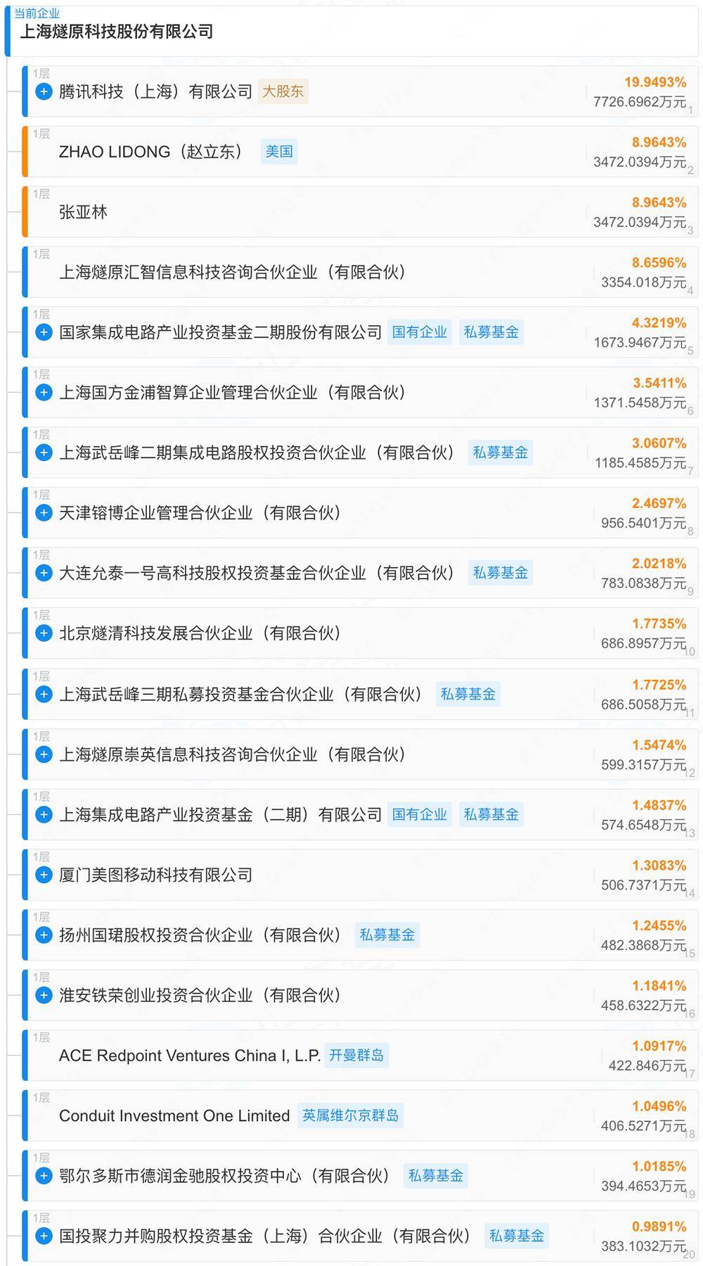 企业征信机构企查查显示,腾讯是燧原科技最大股东,持股比例为19.95%,曾参与燧原科技多轮融资。赵立东、张亚林并列为燧原科技第二大股东,分别持股8.96%。国家大基金二期持股4.32%,是燧原第五大股东。美图是其第十四大股东,持股1.31%。