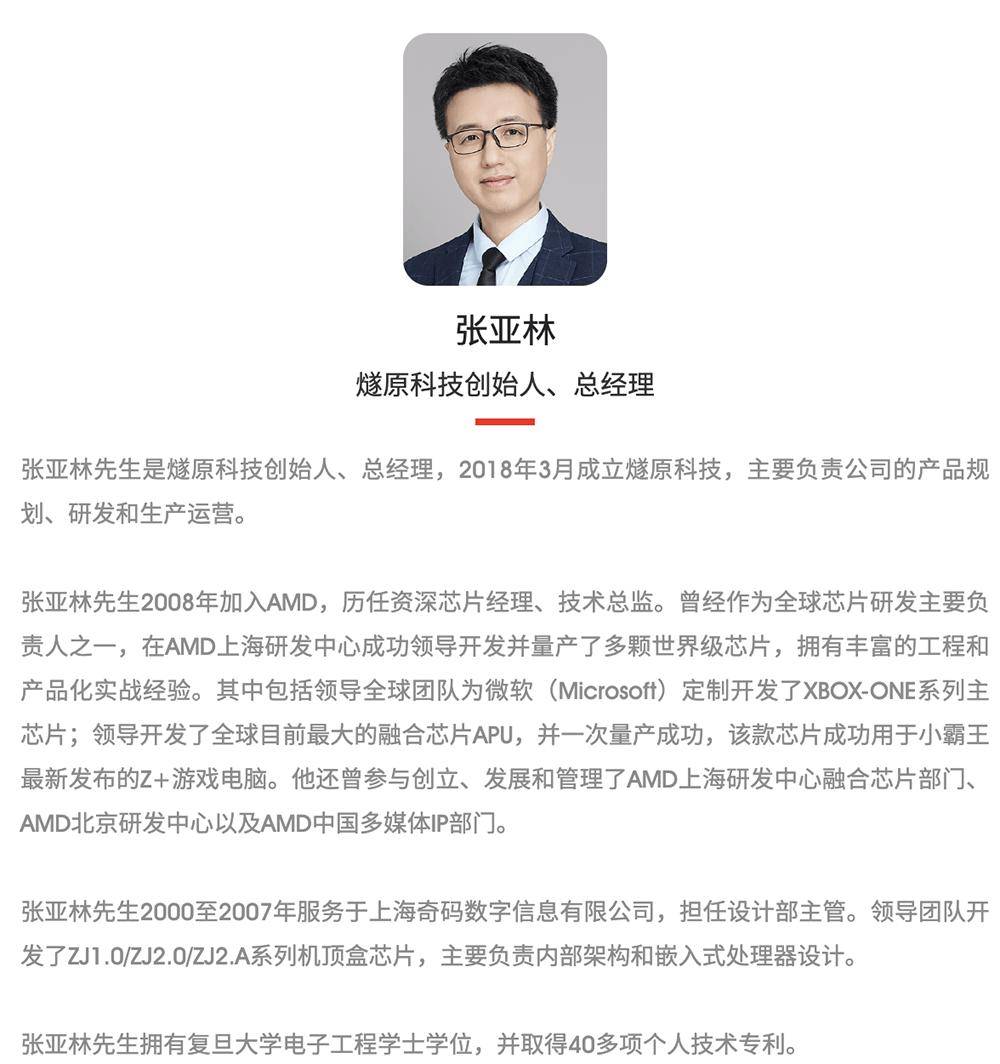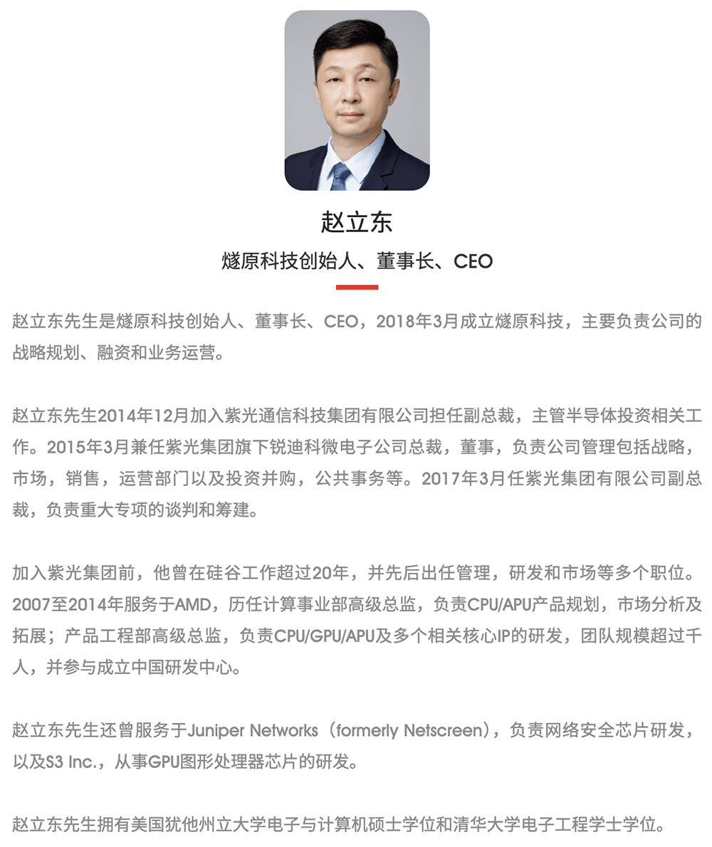 其创始人赵立东、张亚林均曾任职于国际芯片巨头AMD。赵立东本科毕业于清华大学电子工程系,硕士毕业于美国犹他州立大学电子与计算机系。张亚林本科毕业于复旦大学电子工程系。