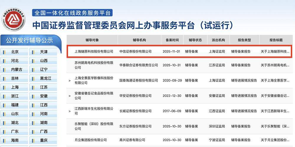 芯东西11月1日报道,今日,证监会官网披露,上海AI芯片龙头燧原科技在上海证监局办理辅导备案登记,辅导机构为中信证券。