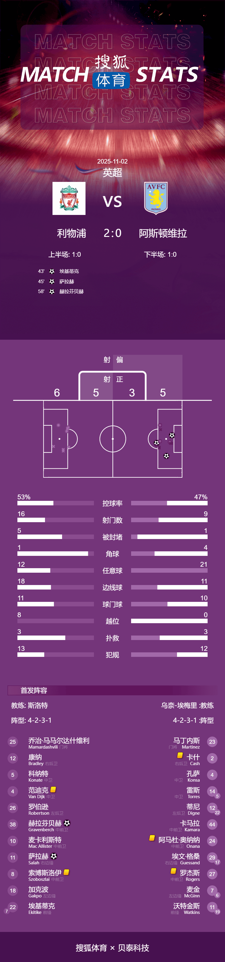 北京时间11月2日凌晨04时,2025-26赛季英超联赛第10轮继续进行,卫冕冠军利物浦坐镇安菲尔德球场2-0战胜阿斯顿维拉,结束联赛四连败,在英超积分榜上暂列第三位,落后榜首阿森纳7分。萨拉赫在上半场补时第1分钟利用马丁内斯失误先拔头筹,赫拉芬贝赫第58分钟扩大领先优势。此外,罗杰斯和卡什各有一次射门被门框阻挡。