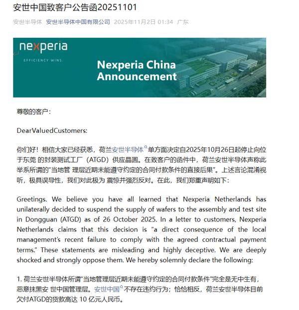 快科技11月2日消息,今天凌晨,安世半导体中国有限公司发布致客户公告函称,相信大家已经获悉,荷兰安世半导体单方面决定自2025年10月26日起停止向位于东莞的封装测试工厂(ATGD)供应晶圆。