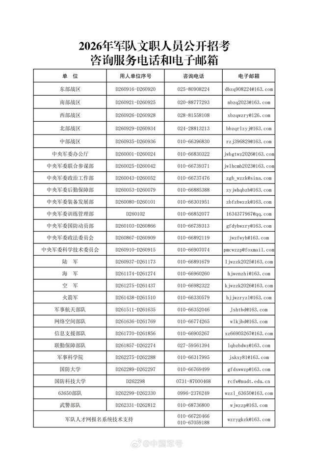 2026年军队文职人员公开招考咨询服务电话和电子邮箱公布