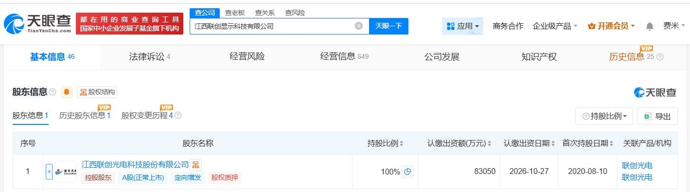 江西联创显示科技有限公司成立于2020年8月,法定代表人为宋荣华,经营范围包括电子元器件制造、电子专用材料销售、电子元器件批发等。股东信息显示,该公司由联创光电(600363)全资持股。
