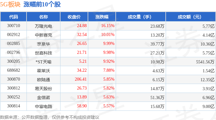 证券之星消息,11月3日5G板块较上一交易日上涨0.39%,万隆光电领涨。当日上证指数报收于3976.52,上涨0.55%。深证成指报收于13404.06,上涨0.19%。5G板块个股涨跌见下表: