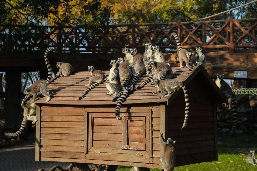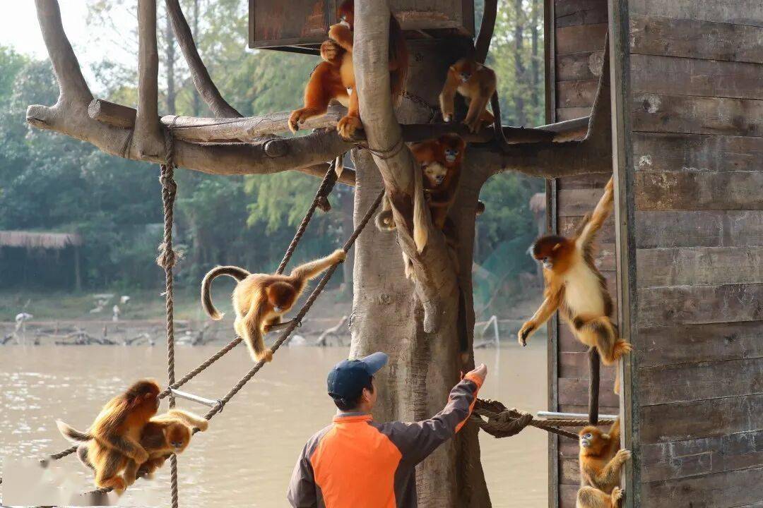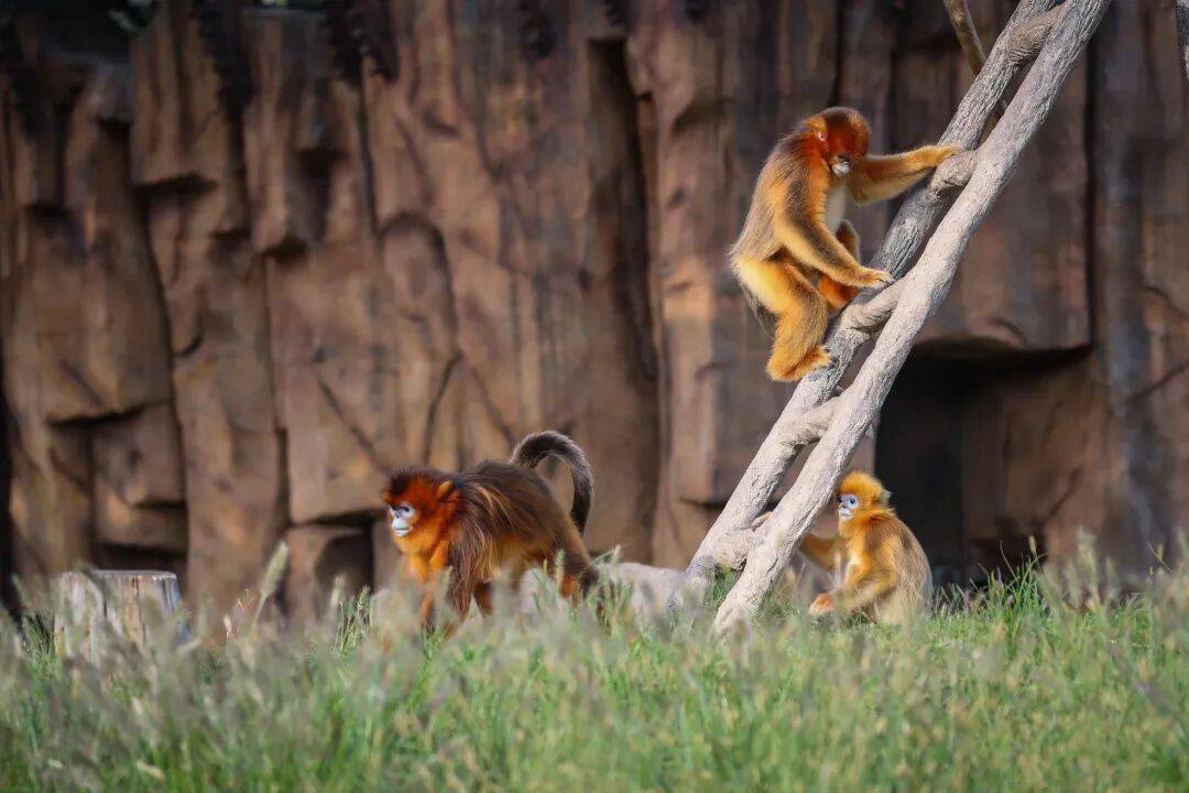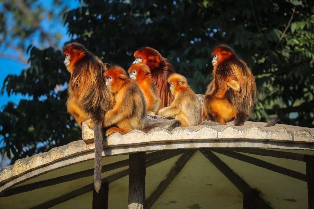 金丝猴家族在树梢、绳索间肆意腾跃,长长的尾巴像平衡杆,动作精准又优雅,金灿灿的毛发在阳光下闪着光。它们一会儿互相理毛,一会儿彼此争夺高处的“观景台”,玩累了就扎堆挤在栖箱里抱团取暖。