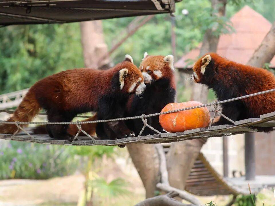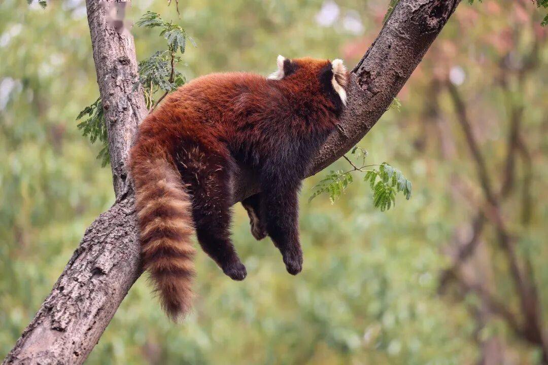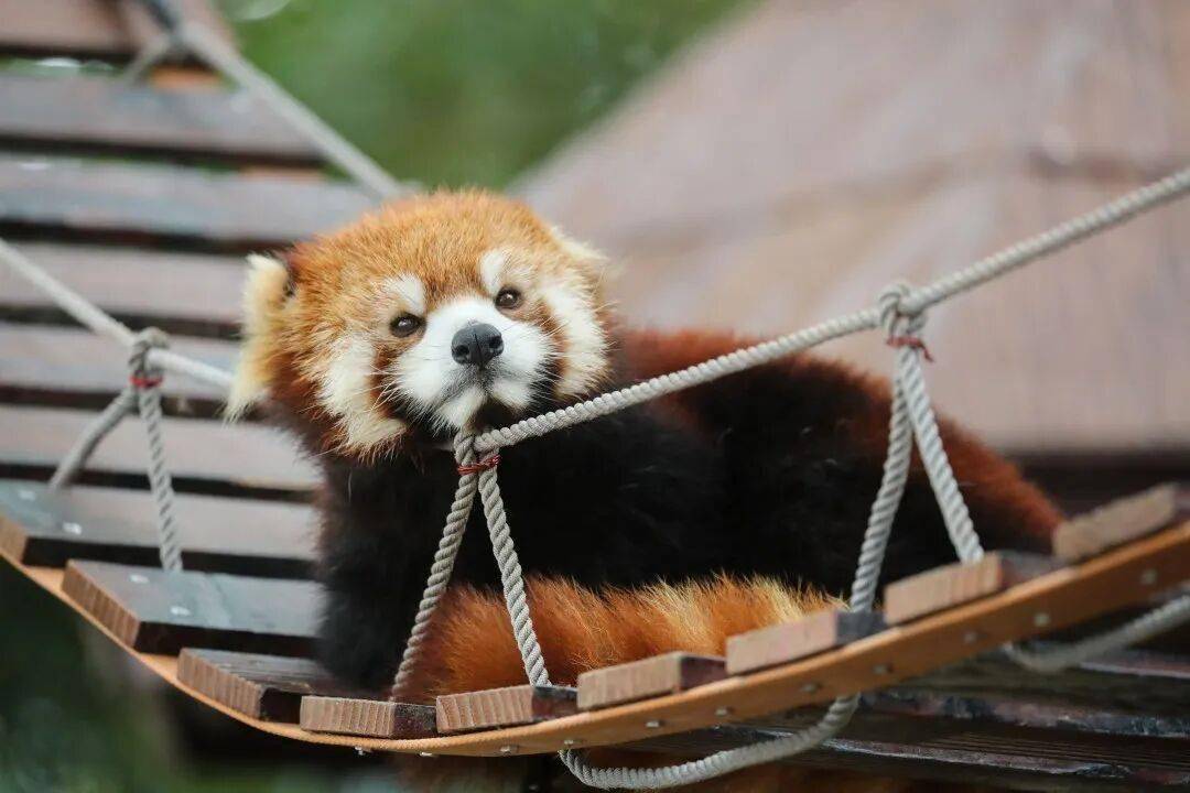小熊猫的秋日关键词是“慵懒+贪吃”!它们最爱在云梯上、树枝间“葛优躺”,把蓬松的尾巴当“抱枕”,时不时闭着眼睛打个盹。