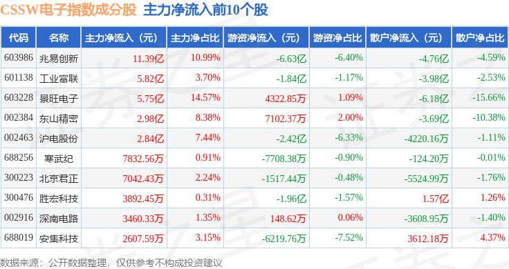 资金流向方面,CSSW电子(399811)指数成份股当日主力资金净流出合计29.35亿元,游资资金净流入合计2.98亿元,散户资金净流入合计26.37亿元。成份股资金流向详情见下表:
