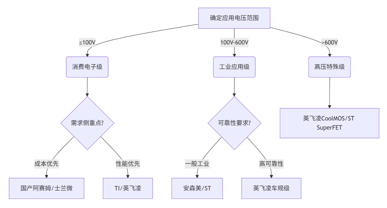 耐压范围是基础选型依据:600V以下适用于消费电子、工业控制等场景;600V以上主要用于光伏逆变器、工业电机驱动等高压领域。