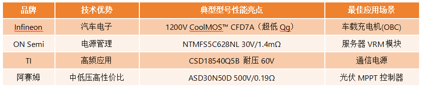 栅极电荷(Qg)决定开关损耗,尤其在高频应用中至关重要。对比TI NexFET™与国产方案,国际大厂通常在Qg参数上具有优势,但国产厂商如阿赛姆通过第五代沟槽工艺已显著缩小差距。