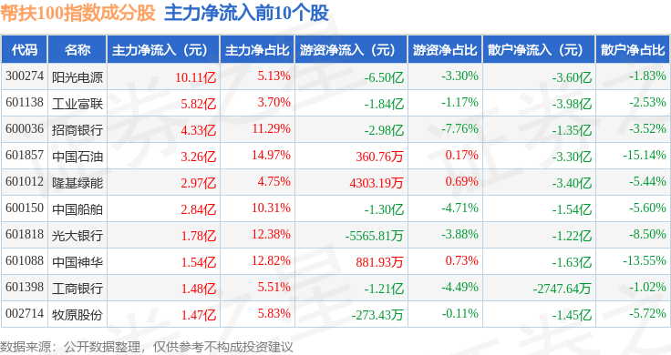 资金流向方面,帮扶100(980065)指数成份股当日主力资金净流出合计60.06亿元,游资资金净流入合计5.88亿元,散户资金净流入合计54.18亿元。成份股资金流向详情见下表:
