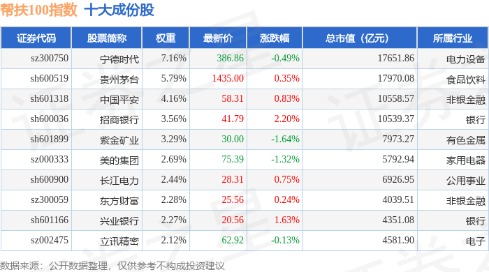 证券之星消息,11月3日,帮扶100(980065)指数报收于2173.58点,涨0.23%,成交2393.14亿元,换手率0.42%。当日该指数成份股中,上涨的有53家,阳光电源以5.09%的涨幅领涨,下跌的有42家,洛阳钼业以3.93%的跌幅领跌。
