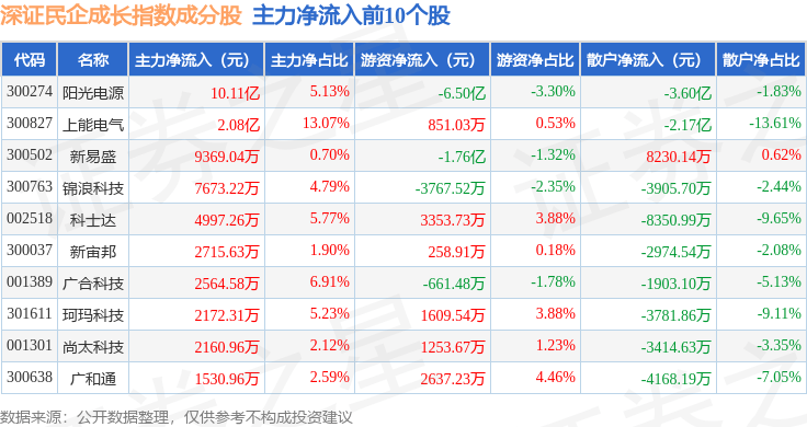 资金流向方面,深证民企成长(970071)指数成份股当日主力资金净流出合计29.73亿元,游资资金净流入合计4.3亿元,散户资金净流入合计25.43亿元。成份股资金流向详情见下表: