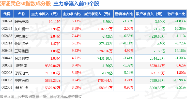 资金流向方面,深证民企50(970057)指数成份股当日主力资金净流出合计35.2亿元,游资资金净流入合计2.88亿元,散户资金净流入合计32.32亿元。成份股资金流向详情见下表:
