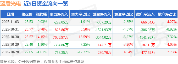 证券之星消息,截至2025年11月3日收盘,蓝盾光电(300862)报收于25.53元,下跌0.93%,换手率4.03%,成交量6.11万手,成交额1.56亿元。