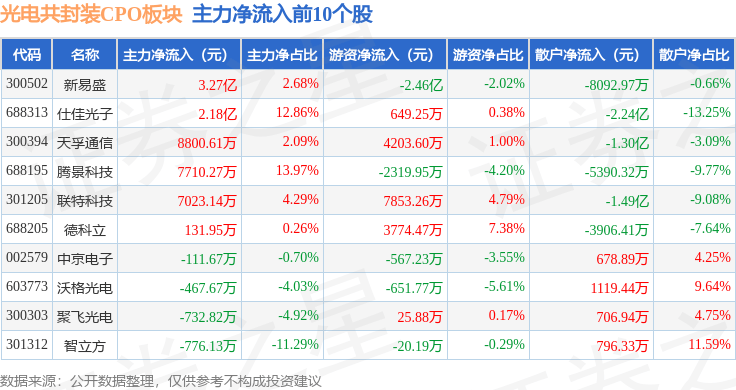 从资金流向上来看,当日光电共封装CPO板块主力资金净流出28.1亿元,游资资金净流入11.08亿元,散户资金净流入17.03亿元。光电共封装CPO板块个股资金流向见下表:
