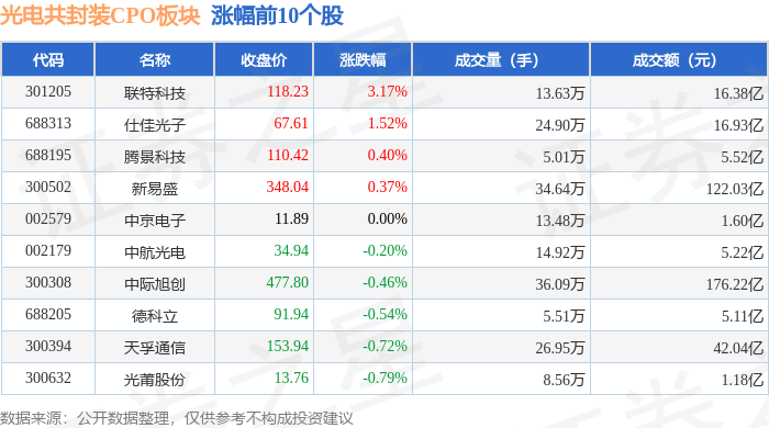 证券之星消息,11月4日光电共封装CPO板块较上一交易日下跌1.08%,亨通光电领跌。当日上证指数报收于3960.19,下跌0.41%。深证成指报收于13175.22,下跌1.71%。光电共封装CPO板块个股涨跌见下表: