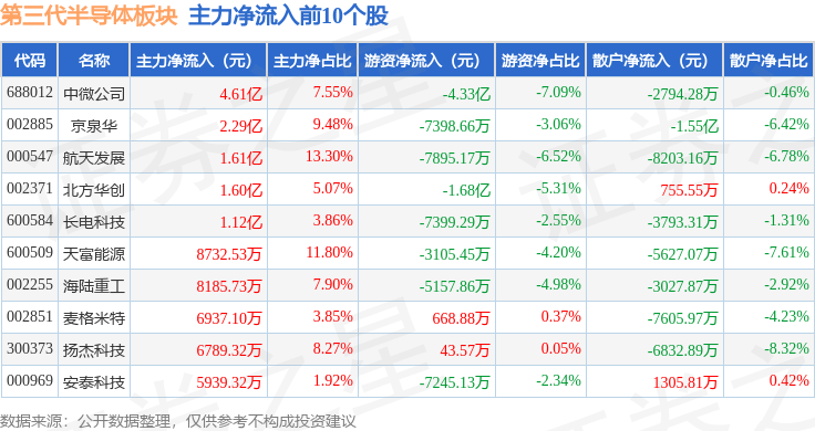 从资金流向上来看,当日第三代半导体板块主力资金净流出45.29亿元,游资资金净流入6.38亿元,散户资金净流入38.91亿元。第三代半导体板块个股资金流向见下表: