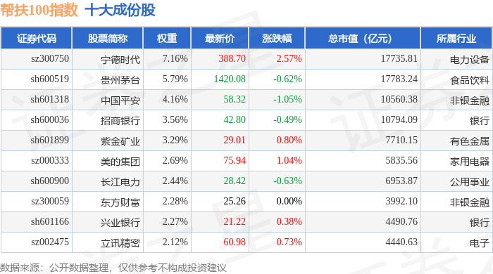 证券之星消息,11月5日,帮扶100(980065)指数报收于2164.18点,涨0.23%,成交2127.36亿元,换手率0.36%。当日该指数成份股中,上涨的有38家,阳光电源以7.11%的涨幅领涨,下跌的有59家,赛力斯以5.56%的跌幅领跌。