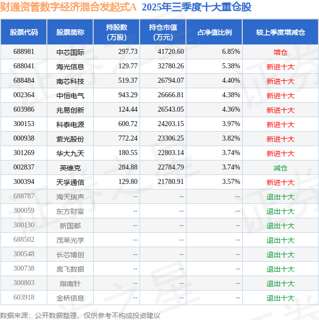 财通资管数字经济混合发起式A的前十大重仓股如下: