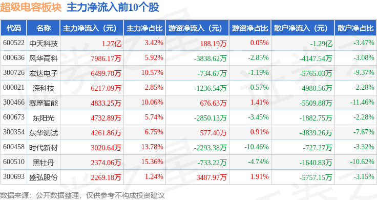 从资金流向上来看,当日超级电容板块主力资金净流出2.02亿元,游资资金净流入2.0亿元,散户资金净流入218.38万元。超级电容板块个股资金流向见下表: