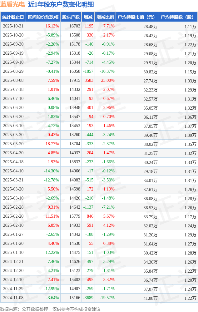 从股价来看,2025年10月20日至2025年10月31日,蓝盾光电区间涨幅为16.13%,在此期间股东户数增加1195.0户,增幅为7.71%。