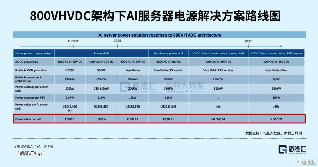 大摩预计,到2027年,为RubinUltra机柜(采用Kyber架构)设计的电源解决方案,其单机柜价值将是当前GB200服务器机柜的10倍以上。同时,到2027年,AI服务器机柜中每瓦功耗对应的电源方案价值,也将比现阶段翻倍。