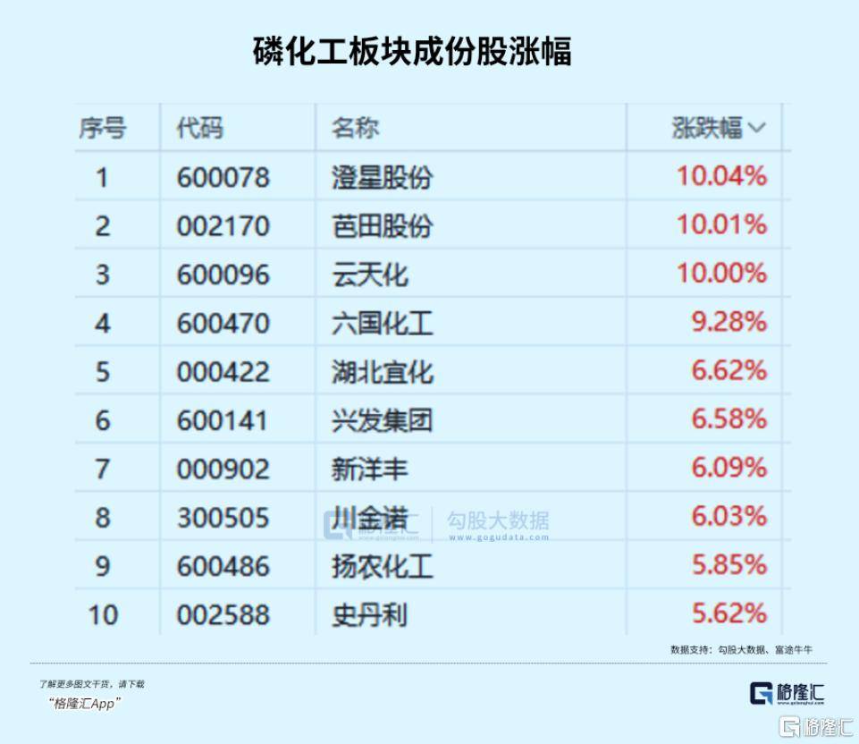 磷化工板块涨幅居前,清水源20cm涨停,澄星股份、芭田股份亦封板,云天化、川金诺、六国化工等多股跟涨。