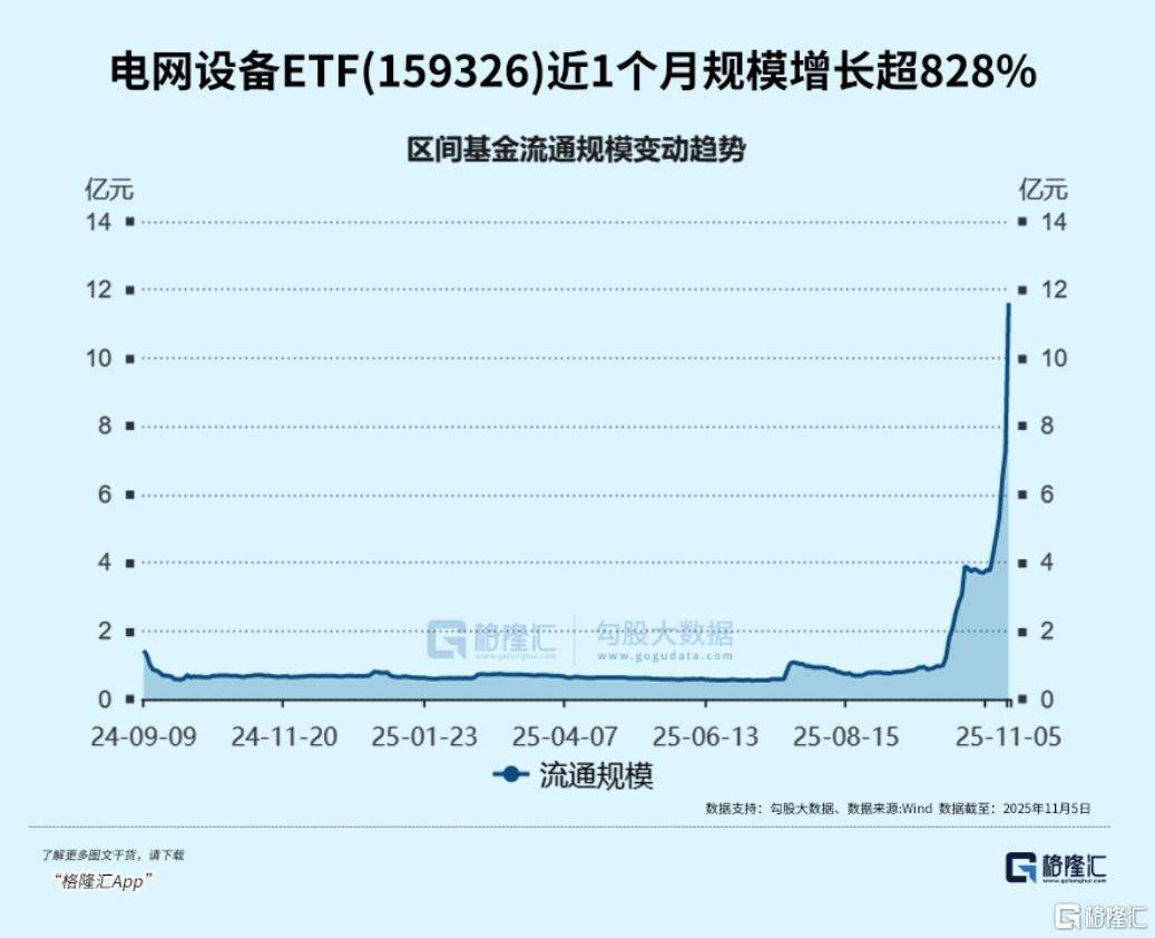 电网设备ETF(159326)昨日吸金3.98亿元,近5日资金净流入超7亿元,最新规模11.61亿元,近1个月规模增长超828%。