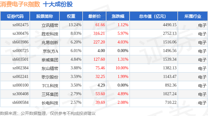 证券之星消息,11月6日,消费电子R(480030)指数报收于8768.59点,涨2.52%,成交958.96亿元,换手率1.94%。当日该指数成份股中,上涨的有42家,东山精密以10.0%的涨幅领涨,下跌的有6家,闻泰科技以4.78%的跌幅领跌。