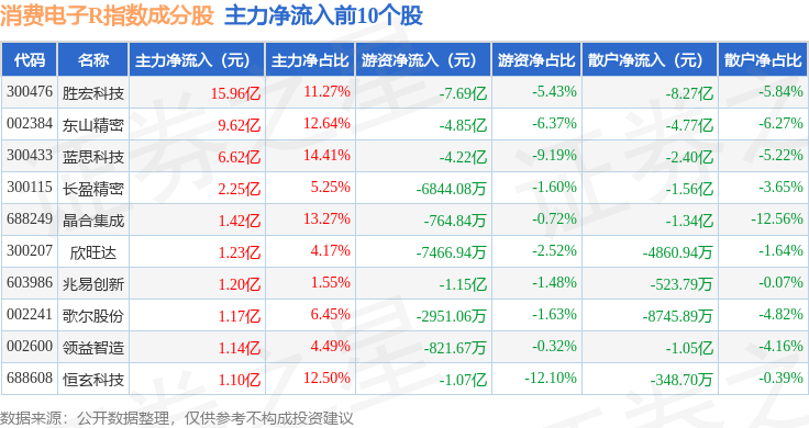 资金流向方面,消费电子R(480030)指数成份股当日主力资金净流入合计42.72亿元,游资资金净流出合计23.4亿元,散户资金净流出合计19.32亿元。成份股资金流向详情见下表: