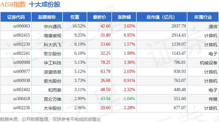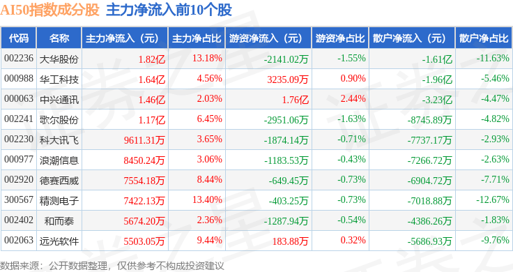 资金流向方面,AI50(399284)指数成份股当日主力资金净流入合计4989.1万元,游资资金净流入合计3.67亿元,散户资金净流出合计4.17亿元。成份股资金流向详情见下表: