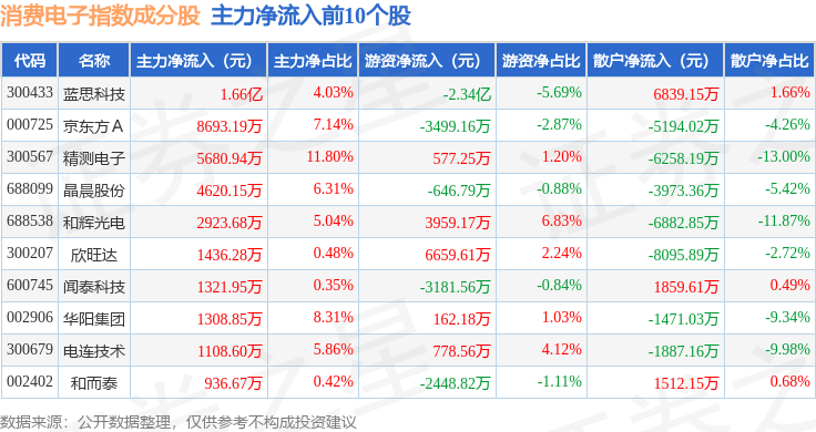 资金流向方面,消费电子(980030)指数成份股当日主力资金净流出合计45.91亿元,游资资金净流入合计5.48亿元,散户资金净流入合计40.43亿元。成份股资金流向详情见下表: