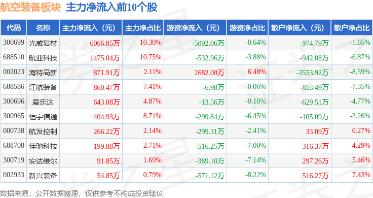 从资金流向上来看,当日航空装备板块主力资金净流出14.27亿元,游资资金净流入2.76亿元,散户资金净流入11.51亿元。航空装备板块个股资金流向见下表: