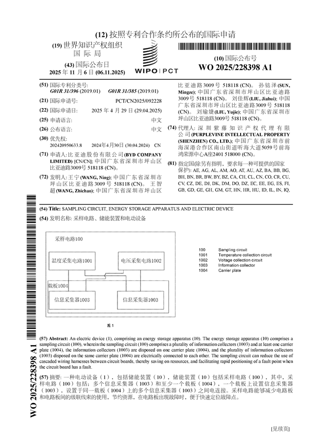证券之星消息,根据企查查数据显示比亚迪(002594)公布了一项国际专利申请,专利名为“采样电路、储能装置和电动设备”,专利申请号为PCT/CN2025/092228,国际公布日为2025年11月6日。