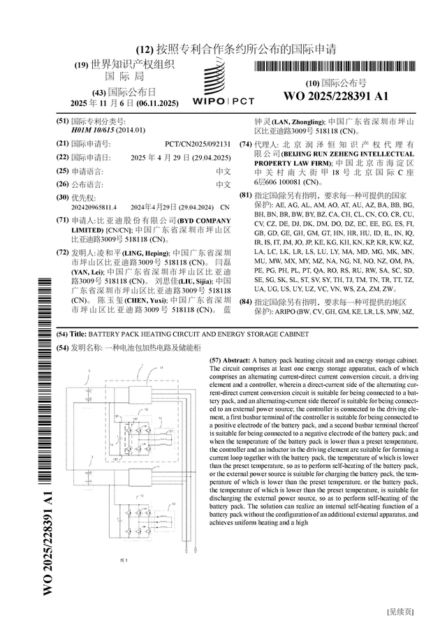 证券之星消息,根据企查查数据显示比亚迪(002594)公布了一项国际专利申请,专利名为“一种电池包加热电路及储能柜”,专利申请号为PCT/CN2025/092131,国际公布日为2025年11月6日。