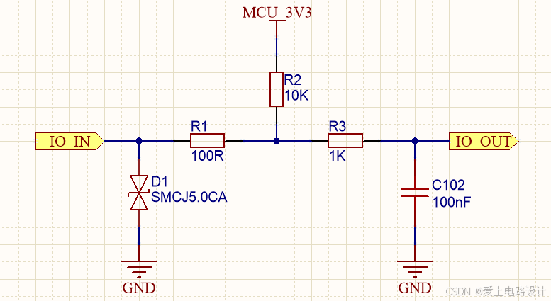 对于一般的 MCU 的 IO口增加的去耦电容为 100nF,前端增加寄生电容较小的 TVS管,或者合适的 RC电路,减小干扰。