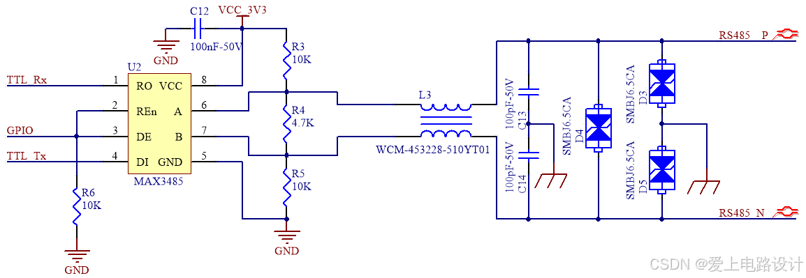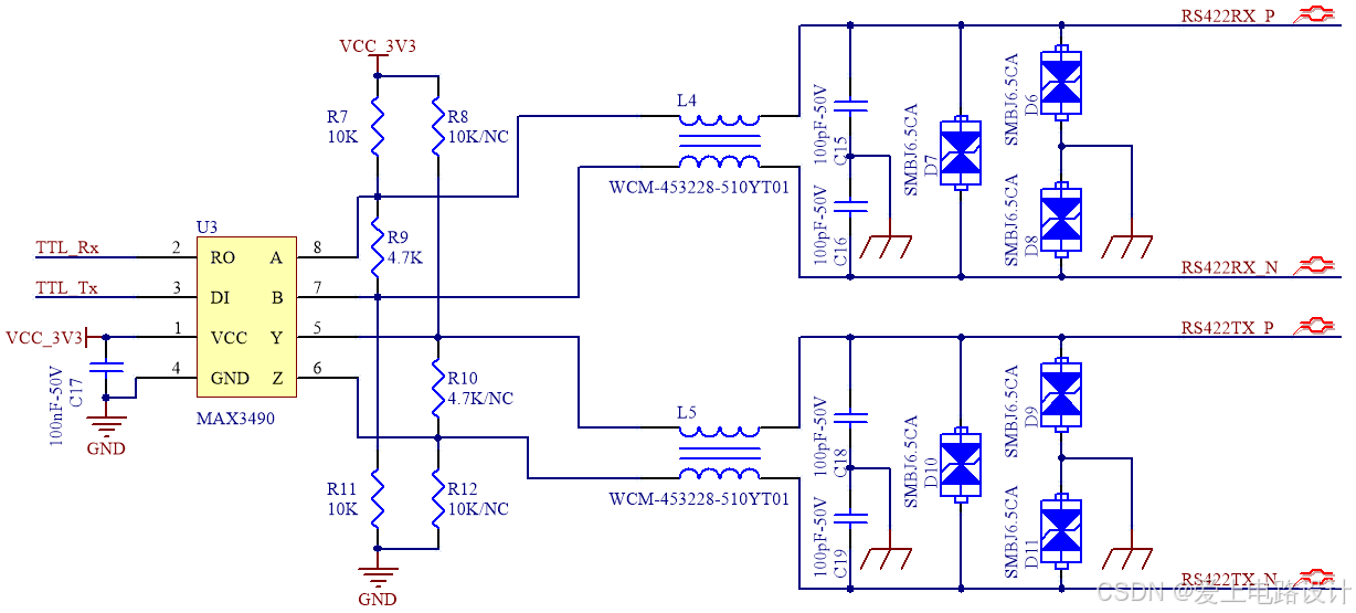 从上述可知,RS232不是差分信号,只需TVS管、磁珠和330p电容就可完成EMC的电路设计;RS485和RS422的EMC电路设计是一样的,都是由一样参数的共模电感、TVS管和100p电容完成设计的。