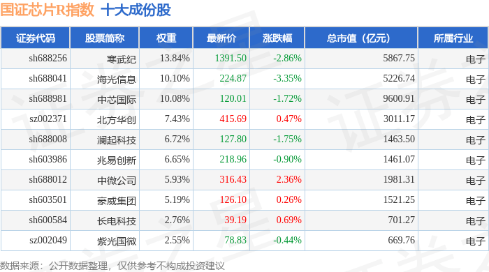 证券之星消息,11月10日,国证芯片R(480017)指数报收于14103.66点,跌0.5%,成交812.92亿元,换手率2.35%。当日该指数成份股中,上涨的有16家,北京君正以10.22%的涨幅领涨,下跌的有14家,海光信息以3.35%的跌幅领跌。