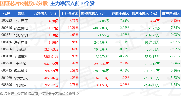 资金流向方面,国证芯片R(480017)指数成份股当日主力资金净流出合计20.7亿元,游资资金净流入合计7.93亿元,散户资金净流入合计12.77亿元。成份股资金流向详情见下表: