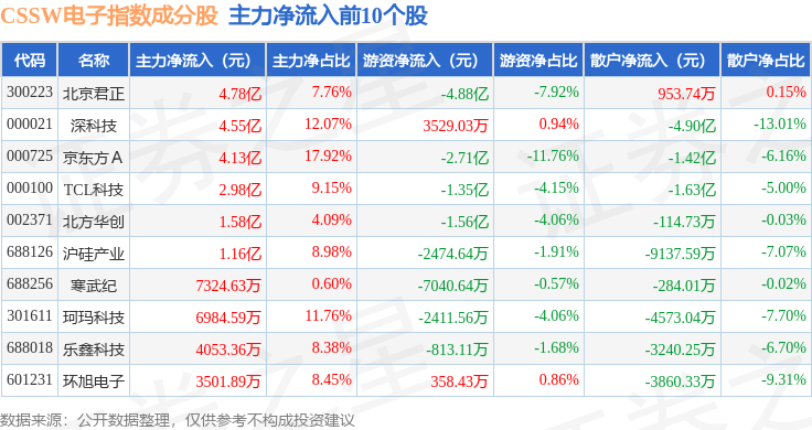 资金流向方面,CSSW电子(399811)指数成份股当日主力资金净流出合计76.74亿元,游资资金净流入合计13.61亿元,散户资金净流入合计63.13亿元。成份股资金流向详情见下表: