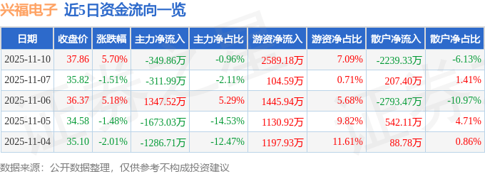 证券之星消息,截至2025年11月10日收盘,兴福电子(688545)报收于37.86元,上涨5.7%,换手率13.31%,成交量9.7万手,成交额3.65亿元。