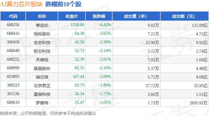 证券之星消息,11月11日AI算力芯片板块较上一交易日下跌2.24%,寒武纪领跌。当日上证指数报收于4002.76,下跌0.39%。深证成指报收于13289.0,下跌1.03%。AI算力芯片板块个股涨跌见下表: