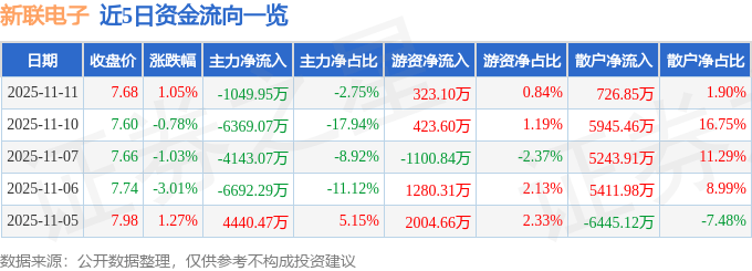 证券之星消息,截至2025年11月11日收盘,新联电子(002546)报收于7.68元,上涨1.05%,换手率6.17%,成交量49.45万手,成交额3.82亿元。