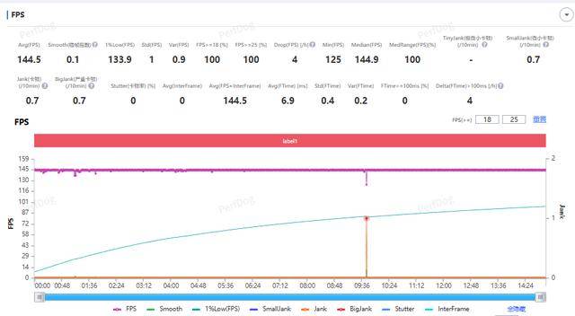 在一局5v5天梯回放赛当中,平均游戏帧数达到了144.5FPS,稳帧指数0.1,1%low帧都有133.9FPS,比其他120帧机型的平均帧数还要高。