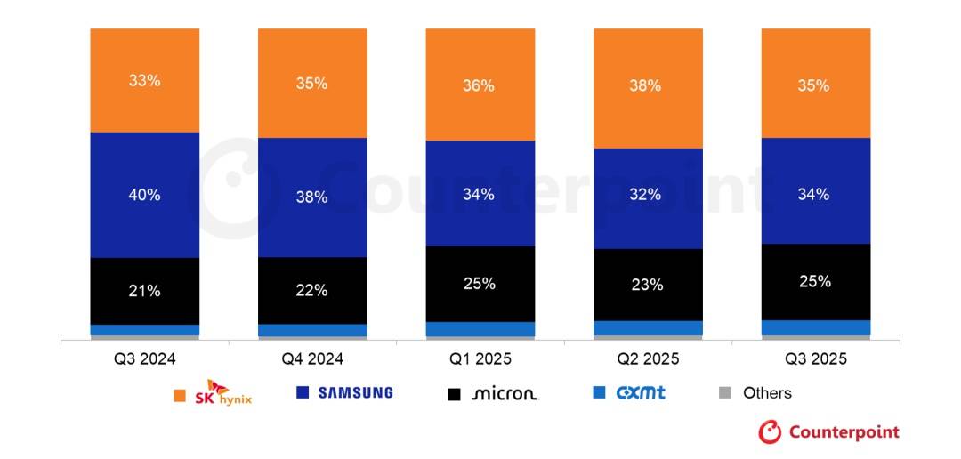 ▼2024年Q3至2025年Q3 DRAM市场份额分布。图源:Counterpoint Research Memory Tracker