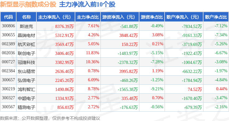 资金流向方面,新型显示(970048)指数成份股当日主力资金净流出合计17.11亿元,游资资金净流入合计5.93亿元,散户资金净流入合计11.19亿元。成份股资金流向详情见下表: