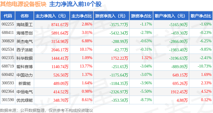 从资金流向上来看,当日其他电源设备板块主力资金净流出6.04亿元,游资资金净流入8147.5万元,散户资金净流入5.22亿元。其他电源设备板块个股资金流向见下表: